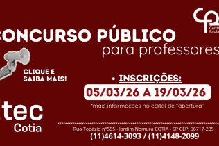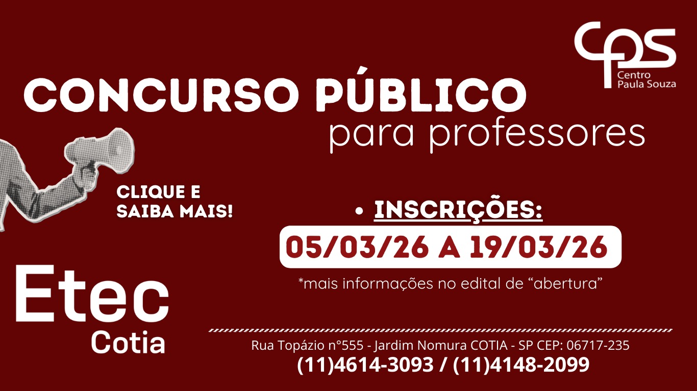 Estão abertos o processo do concurso público para docentes do Centro Paula Souza, com vagas na Etec de Cotia! 👩🏫📚 📌 Redução ou isenção da taxa de inscrição:Solicitações de 02/03/2026 a 04/03/2026. 📝...