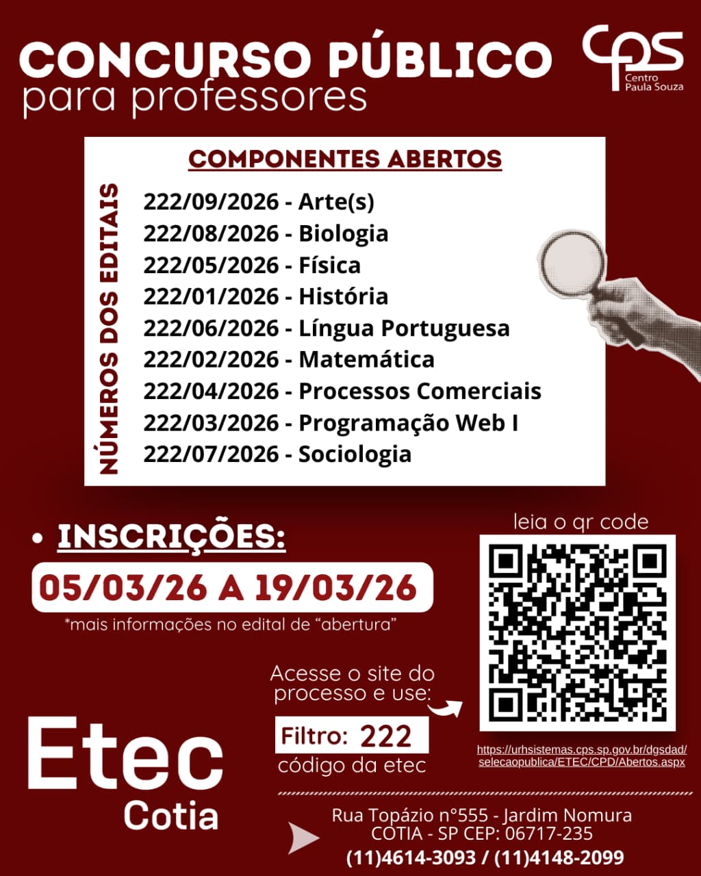Estão abertos o processo do concurso público para docentes do Centro Paula Souza, com vagas na Etec de Cotia! 👩‍🏫📚
