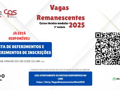 🔔 Processo Seletivo – Vagas Remanescentes 2025A Etec de Cotia está com inscrições abertas para o Processo Especial de Seleção de Vagas Remanescentes do curso Técnico em Administração – período noturno, com ingresso no 1º […]
