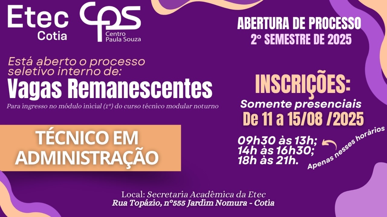 A Etec de Cotia está com inscrições abertas para o Processo Especial de Seleção de Vagas Remanescentes do curso Técnico em Administração – período noturno, com ingresso no 1º módulo no 2º semestre de 2025.