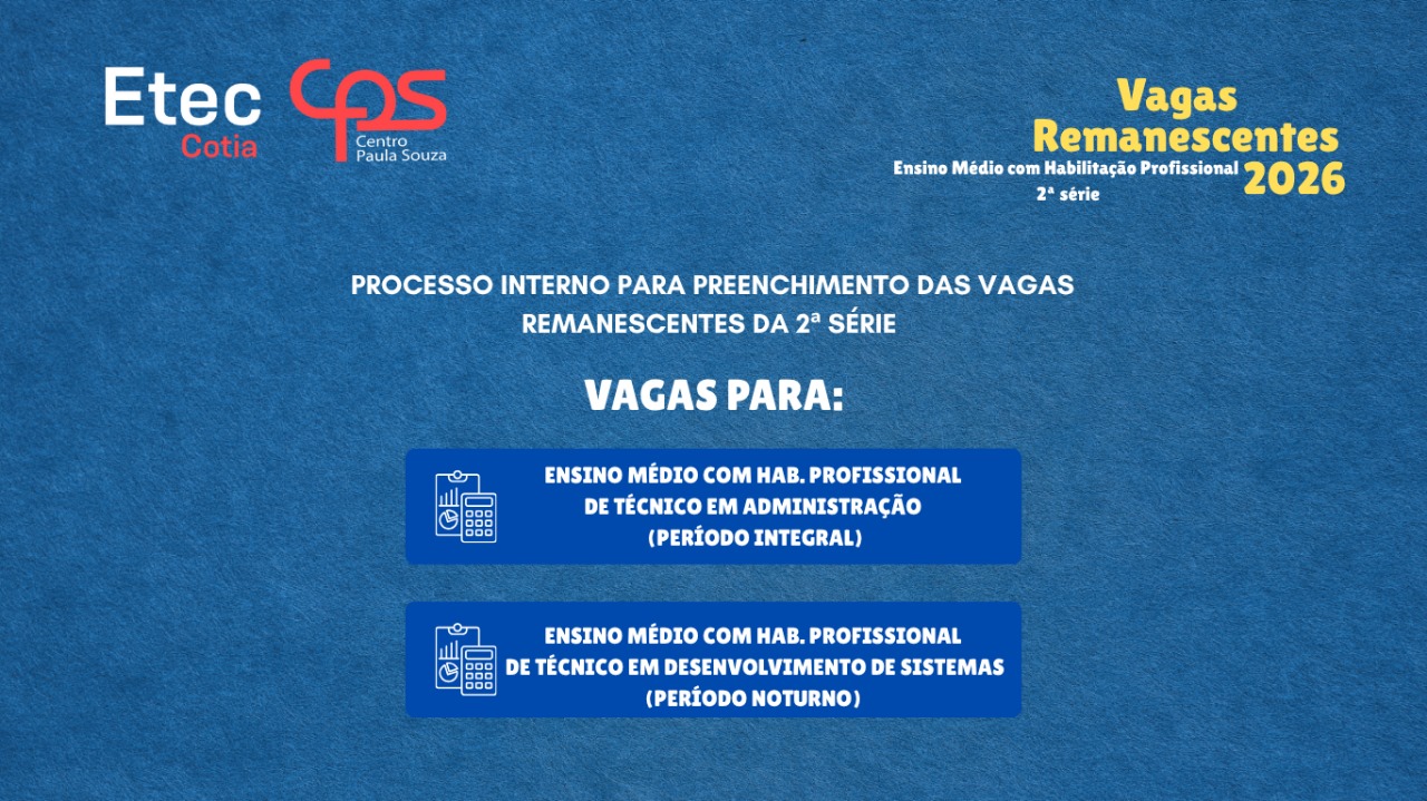 A Etec de Cotia está com inscrições abertas para o Processo Especial de Seleção de Vagas Remanescentes do Ensino Médio com Habilitação Profissional de Técnico em Administração (período integral) e Ensino Médio com Habilitação Profissional de Técnico em Desenvolvimento de Sistemas (período noturno) com ingresso na 2ª série no 1º semestre de 2026.