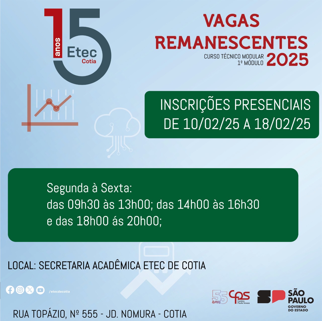 📍Local: Secretaria Acadêmica da Etec de Cotia – Rua Topázio, 555 – Jardim Nomura – Cotia