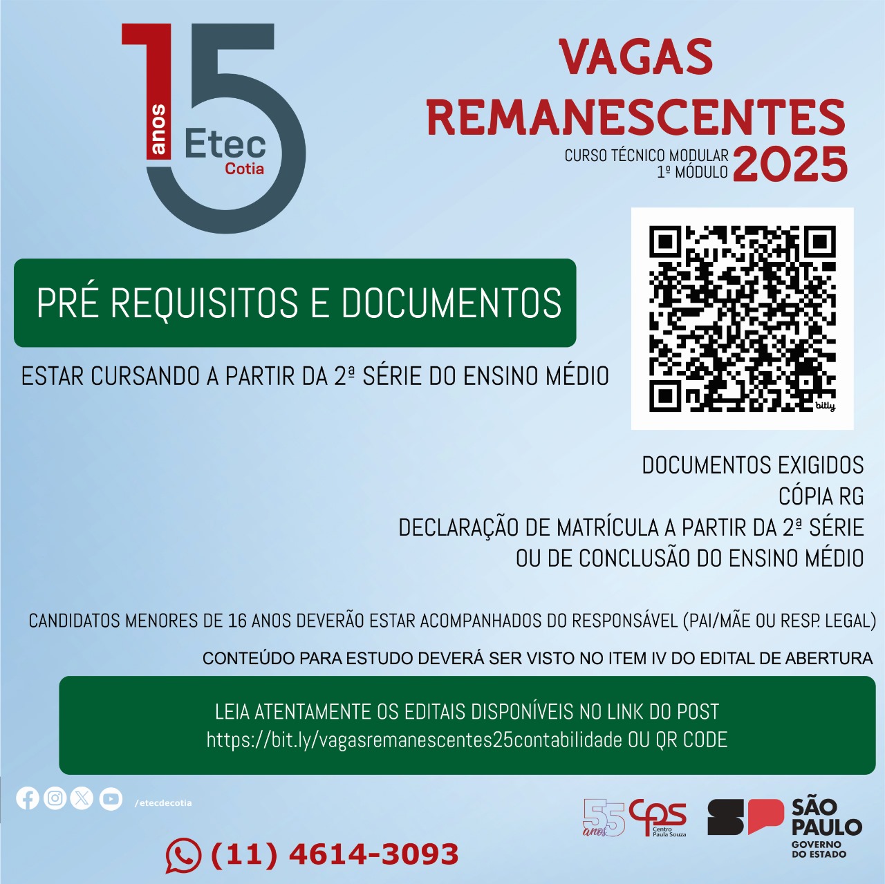 ⚠ ATENÇÃO ⚠ 📝 PROCESSO SELETIVO INTERNO PARA PREENCHIMENTO DAS VAGAS REMANESCENTES DO 1º MÓDULO DO CURSO TÉCNICO EM CONTABILIDADE📆 INSCRIÇÕES DE 10/02/25 ATÉ 18/02/25 📍Local: Secretaria Acadêmica da Etec de Cotia – Rua Topázio, […]